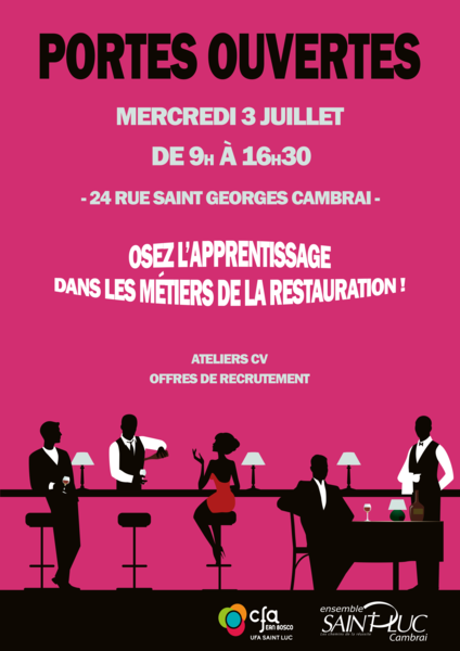 Portes ouvertes les mercredi 3 juillet ! Intéressé(e) par les métiers de la restauration ? Notre centre de formation ouvre ses portes le mercredi 3 juillet de 9h à 16h30 au 24 rue Saint-Georges à Cambrai. Viens découvrir les différents métiers qui existent dans cette branche professionnelle et les parcours