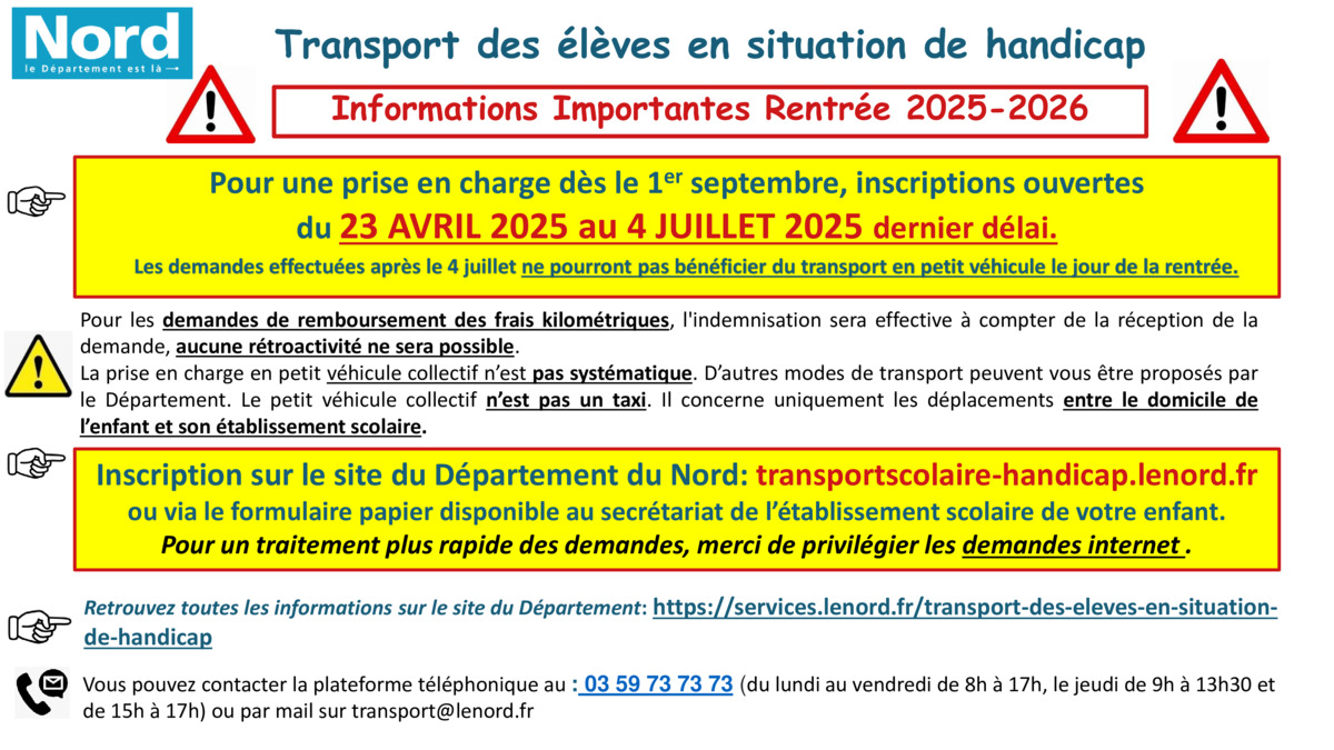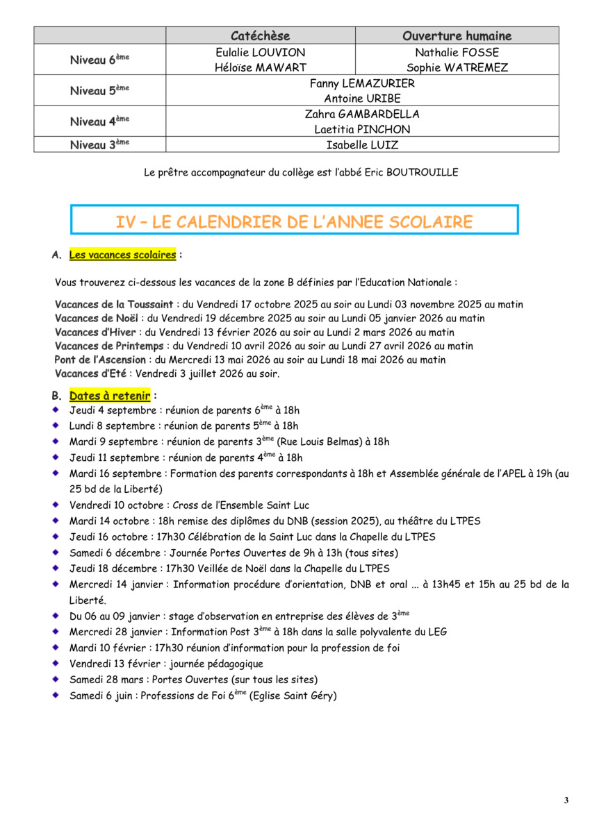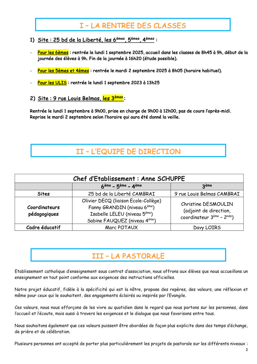 Rentrée le lundi 1 septembre 2025, accueil dans les classes de 8h45 à 9h, début de la journée des élèves à 9h. Fin de la journée à 16h20 (étude possible).